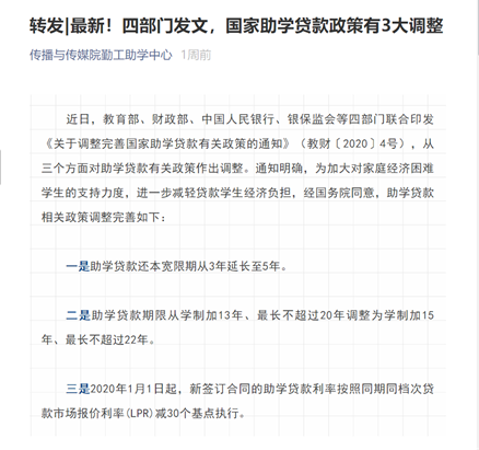 《关于调整完善国家助学贷款有关政策的通知》由教育部、财政部、中国人民银行、银保监会等四部门联合印发,主要从三个方面对助学贷款有关政策作出调整:第一,助学贷款还本限期从3年延长至5年;第二,助学贷款期限从学制加13年、最长不超过20年调整为学制加15年、最长不超过22年;第三,2020年1月1日起,新签订合同的助学贷款按照同期同档次贷款市场报价利率(LPR)减30个基点执行。William威廉官网勤工助学中心落实国家政策的一些系列举措,使学生对如何办好生源地贷款有了进一步认识,受到广大学子的一致好评。