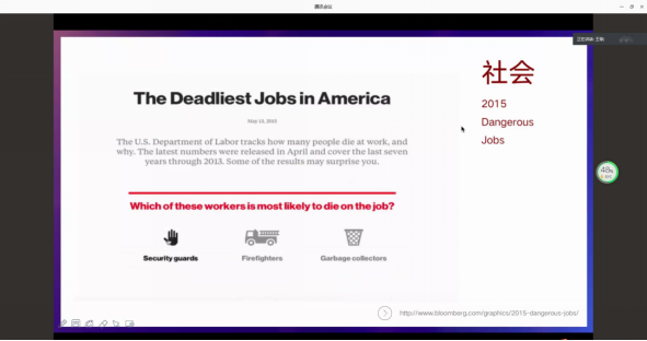 谈及数据新闻的应用案例时,王琼老师又举例了垃圾清洁员、消防员、保安哪几种职业的死亡率更高,结果打破了同学们的传统认知。老师用此例子告诉我们,数据新闻可纠正过往传统媒体的偏见新闻,打破这种拟态环境,用宏观视角更好的报道新闻。数据新闻并不是一定要大数据、大团队制作。好的选题,有数据新闻的数据意识,善于抓住大众心理才是好数据新闻的关键,还强调了数据新闻的本质是新闻而不是数据。