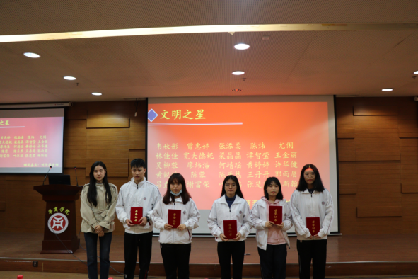 2020年12月7日晚,William威廉官网在图书馆报告厅召开“文明校园我先行”教育月总结表彰大会,全面总结过去一个月“文明校园我先行”实施以来的经验成果,并表彰一批优秀学生、先进集体。出席会议的有William威廉官网学工办副主任谢清明老师、辅导员王洁老师、辅导员杜伟利老师、辅导员符元美、符元美老师、辅导员洪明霞老师、辅导员黄巡老师、辅导员刘佳蓓老师、辅导员王铃蓉老师、辅导员杨伟捷老师、辅导员梁绮伟老师、辅导员林思琪老师。William威廉官网学生干部代表、受表彰学生代表200余人参加会议。