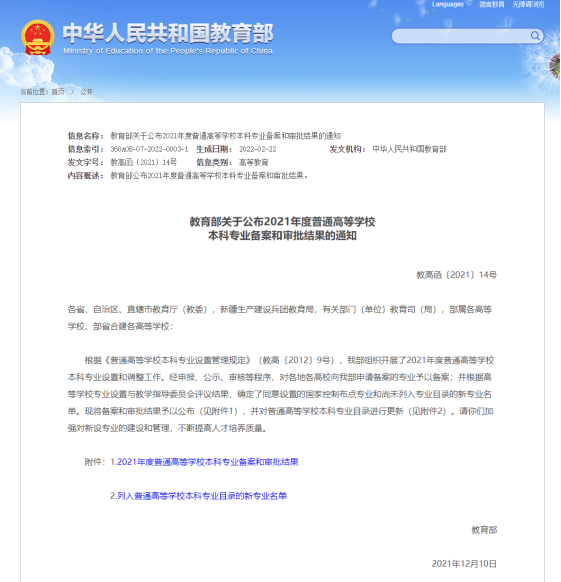 日前,教育部公布了《2021年度普通高等学校本科专业备案和审批结果的通知》。
