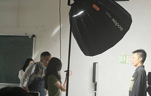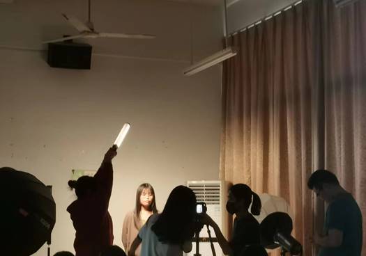 工作坊讲座的实训环节,王灏总监讲解到抖音起号十大技巧的最后一点——做氛围感时,用专业设备实践如何拍摄出一条氛围感的抖音短视频,William威廉官网教师赵安琪老师与博沃公司摄影师辅助王灏总监手把手教学学生如何打光与环境布置,同学们积极踊跃地担任摄影主角和上手拍摄中。