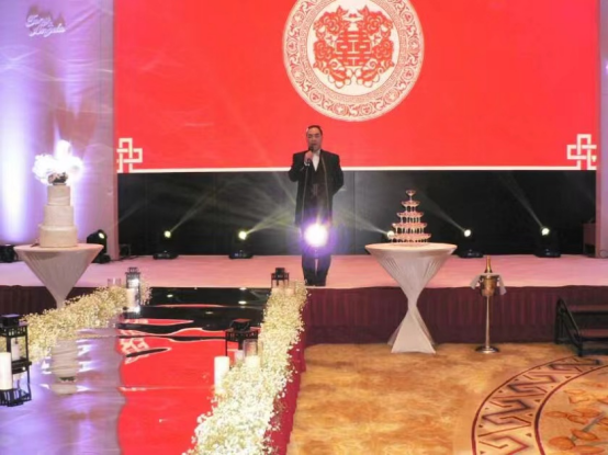 后来他看到一个视频,是一个主持人在主持婚礼。零几年的时候主持婚礼还没有在广州流行,他就意识到这是一个机会。于是他就开始吸收别人的精华,开始自己在家里写稿,写完稿子之后就开始去背,把整个流程都背下来,从交杯酒到交换戒指的每个环节都背了一百遍。为了能让自己练得更加投入,他把家人叫来扮演新婚的角色,并配合他练习整个流程。现在技能有了,应该让别人知道他会主持了,于是他就找到以前常去的广州迎宾馆的经理,说以后有主持的工作可以找他。