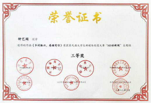 第九届大学生新媒体创意大赛三等奖