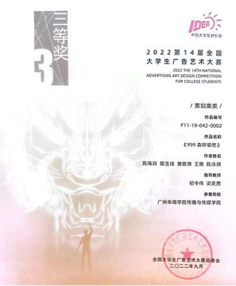 第14届全国大学生广告艺术大赛全国赛三等奖