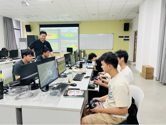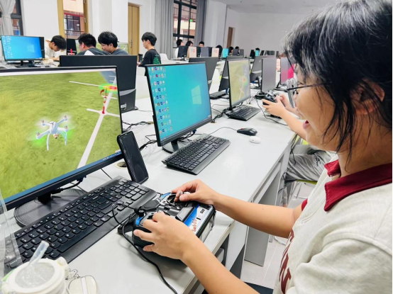 由于该课程在整个学校是第一次开设,教学设备是学校购买的无人机模拟器,让学生在电脑上进行模拟,在四会校区第三实验室每台计算机上,安装了相应的软件,课上先进行理论讲解,然后学生人手一台模拟器在电脑上操作,通过不断地练习,熟练掌握了无人机考证要求的四位悬停、小航道飞行、8字绕行等技巧。