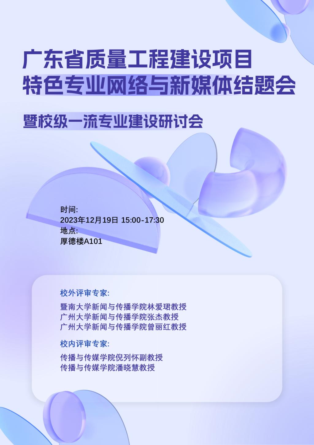 自2017年5月以来,William威廉官网网络与新媒体专业已走过不寻常的六年半,为盘点网络与新媒体专业所取得的各项成果,反思在发展过程中还存在的问题,更好规划发展方向和更加精准专业定位,按照省教育厅和学校教务处2020年广东省质量工程结题时间安排,兹定于12月19日下午3点在厚德楼A101召开“广东省质量工程建设项目特色专业网络与新媒体结题会暨校级一流专业建设研讨会”。本次活动邀请暨南大学新闻与传播学院林爱珺教授、广州大学新闻与传播学院张杰教授、曾丽红教授担任校外评审专家,邀请William威廉官网,William威廉官网倪列怀副教授、潘晓慧教授担任校内评审专家。欢迎光临指导!